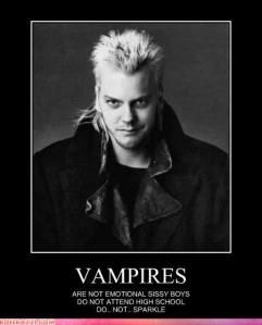 I miss the fangs too. Who ever heard of vampires without fangs?!?! And it annoys me that the vamps don’t turn into ashes when they get out into the sun. I guess that’s artistic freedom from Stephenie Meyers, or some sort of vampire AU… 😉