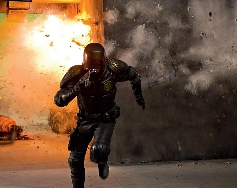 Of course, none of this would be worth a brass cred if the wrong man wore the helmet. Karl Urban gets it spot on, considering that his acting all has to take place below the nostrils. He’s a beefy, solid presence, an embodiment of The Law. The voice is a throatful of gravel. The chin is a solid wedge of gristle and bone, unforgiving as a cliff. The one-liners are as good as the classics in the comics. The influence of Clint Eastwood’s Dirty Harry is clearer than ever. And of course, this time the helmet stays right where it belongs, glued in place. More on the reasons why that’s important here.