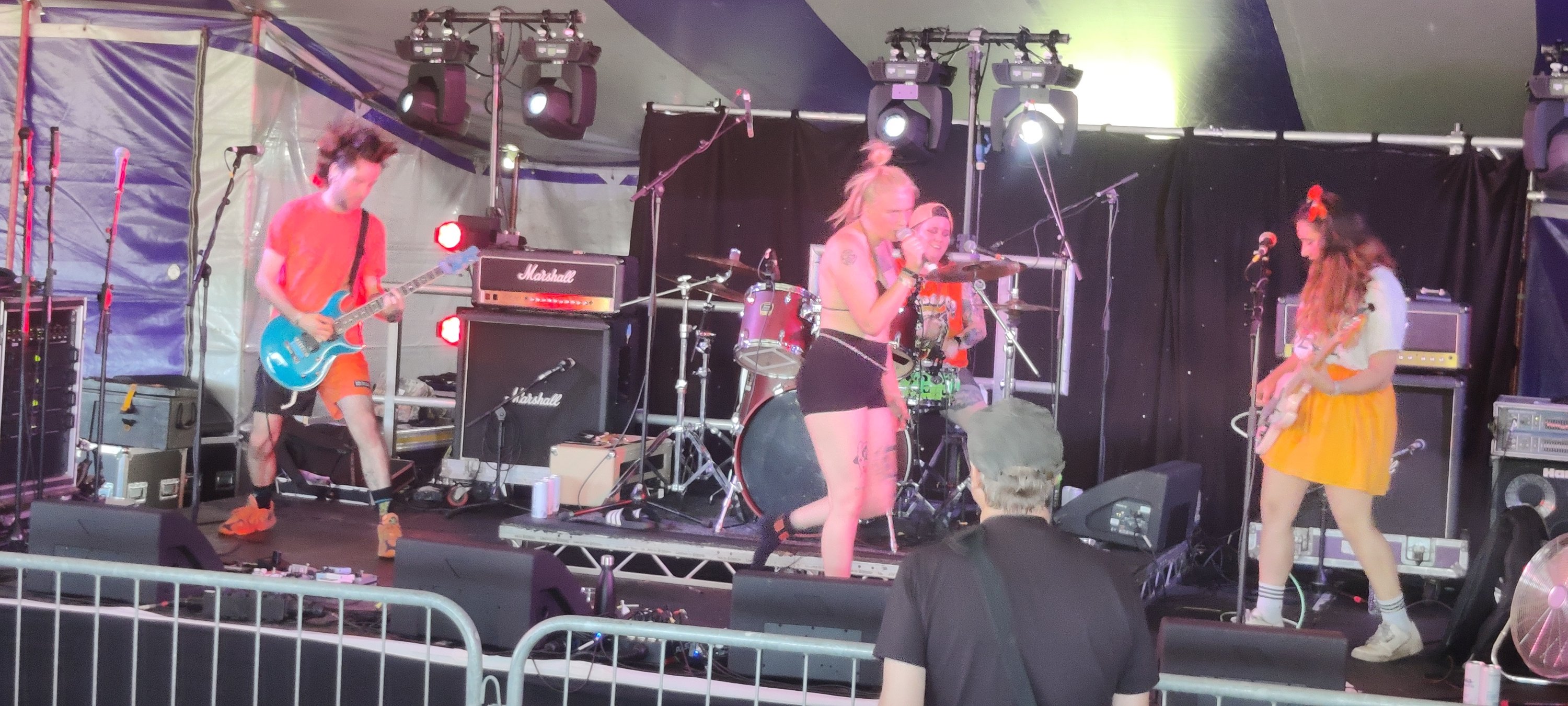 The Readipop stage was subject to a BBC Introducing takeover, handy for us as we just parked up in our usual spot and let the music roll by. Du’Val brought all of his extended family along, packing out the tent for his soulful funky tunes. Elucidate changed the tempo with some great shoegazey sounds–we were reminded of local legends Slowdive at times, which is never a bad thing. Wynona’s country-adjacent stylings gave us early REM flashbacks–if their guitarist arpeggiated his chords we’d be deep into Peter Buck territory. Someone get that guy a Rickenbacker! None of this is a complaint, by the way–early REM is our happy place. Meanwhile doops (note the lower-case) regretted their choice of white boiler suits as stage wear in the increasingly sauna-like conditions. The music, like the band, were hot and heavy.
