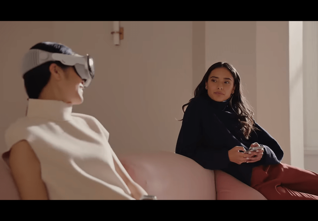 You can just see goggle-girl’s eyes through the mask, right? Nope. You’re looking at an OLED screen with a projection of her eyes, taken using more of the Vision Pro’s internal cameras. Both women, sitting a couple of feet apart in the same room, are interacting with screens, digital approximations of each other. The only way for them to chat like normal people would be if goggle-girl took the damn mask off. And what would be the point to that?