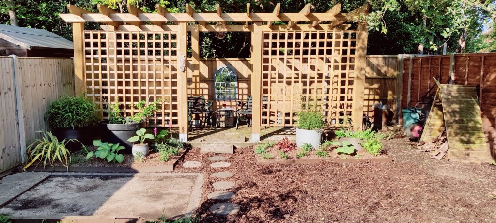 In its place on the slab of concrete that marks the border of our land, there’s a tall and sturdy pergola providing shade and a focal point. Built using a bequest from my beloved nan who passed at the end of 2022, we’ve called it Gwen’s Den. We’re growing clematis and jasmine up either side and made a couple of beds along the front edge to provide a pop of colour and interest. Last autumn I even used it as an impromptu performance area when I hosted Reading Writers’ Novelist’s Day (I really must tell you all about that someday).