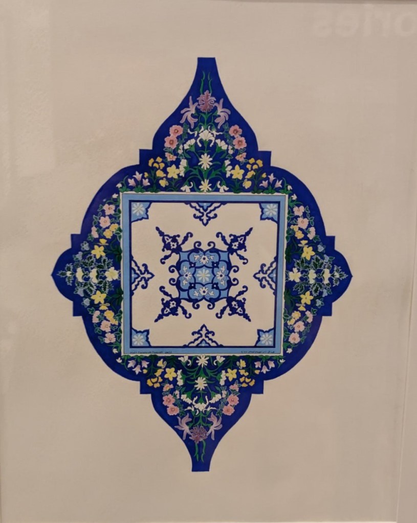 My piece had been inspired by a gouache painting by Palestinian artist Hadil Tamim, who fused the traditions and disciplines of Islamic art with depictions of British flowers. When I first saw Blue Square, I instantly thought of the kind of formal planting common in grand estate gardens which C and I see regularly on our trips around the country. It was instantly evocative, and a response came easily.