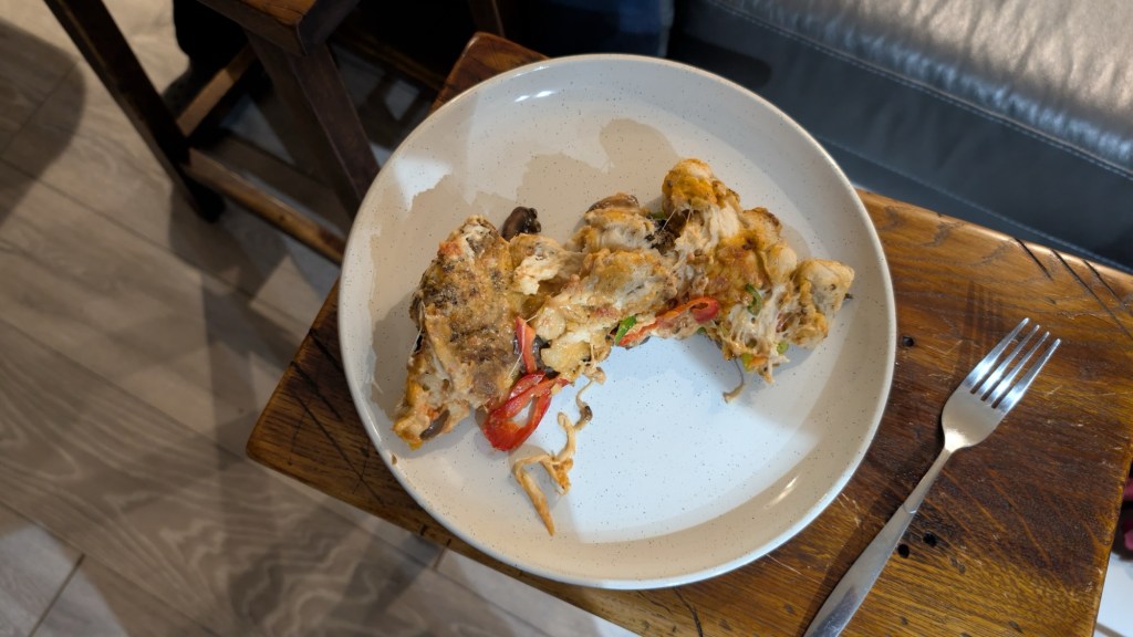 I couldn’t get the darn thing off the peel, and the oven was nowhere near hot enough when I did manage to scrape it into place. It was half-raw, half-burnt, although the flavour of the dough on the tiny bits that were properly cooked was good.