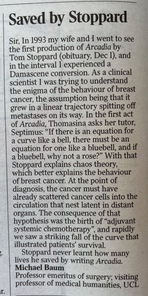 One last thing. We lost Tom Stoppard this week, one of our greatest playwrights. It seems his influence may have extended further than the entertainment field. How many lives has he saved?