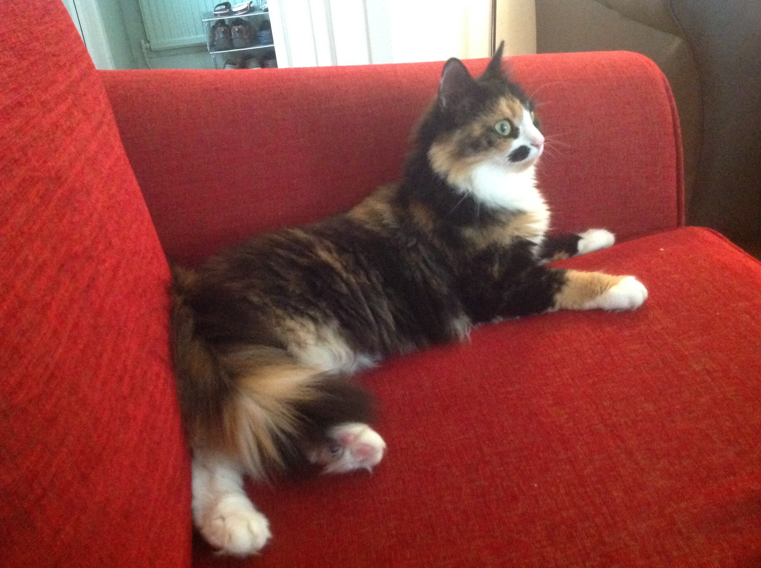 Millicent Wickings. AKA Millie Moomin, Moomintroll, Trollface, Squirrel Pants, Squiggy-moo, Floofball, Fatbits and OH YOU HORROR. Provenance unknown, although I suspect there’s a fat chunk of Norwegian Forest Cat somewhere in her DNA. In the winter she develops a ruff that a Dutch merchant of the 1500s would be jealous of. In the spring she sheds it in knotted clumps and dreadlocks. She’s not a big unit by any means, but in cold weather her winter coat means she bulks up very pleasingly. I can never keep my hands off her, and I bear the scars as consequence.